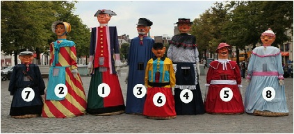 1- JAN (39kg-333cm):gekleed in een 18de eeuws kostuum met pruik en haarstrik, hij herinnert aan de oude reus Jan van de Stad Brussel.